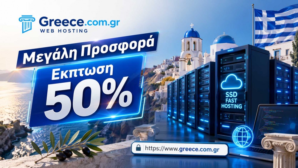 Κατοχυρώστε το όνομα σας και αποκτήστε σήμερα το καλύτερο πακέτο web hosting Greece (φιλοξενίας ιστοσελίδων) για το site σας. Προσφέρουμε πακέτα με ΔΩΡΕΑΝ domain name, cPanel, wordpress, joomla με 1 click, ΔΩΡΕΑΝ Site Builder, απεριόριστα e-mail και πολλά άλλα. Δωρεάν SSL certificate για ασφάλεια και υψηλή κατάταξη στο google!